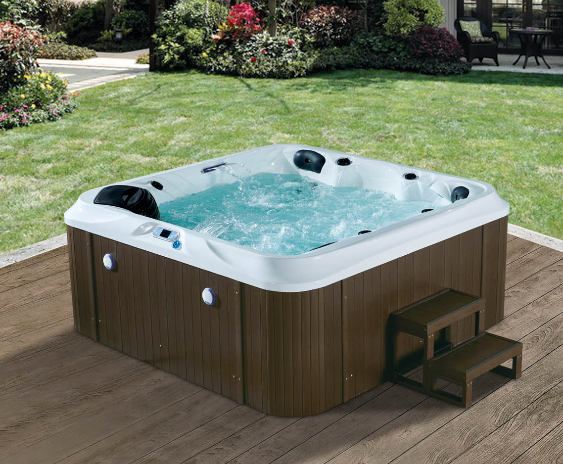 Imported acrylic sheet w Balbol system 2pcs 2HP water pump,700W air pump. 0.35Hp circulation pump. 1pcs 3kw water heater Ozone disinfection 1 pcs bottom underwater light, fountain 2pcs, Massage water jets 67pcs, 12pcs air bubble jets, W 4pcs air adjusting knob, with 4pcs PU pillows, 6 seats, w step and cover, plywood package